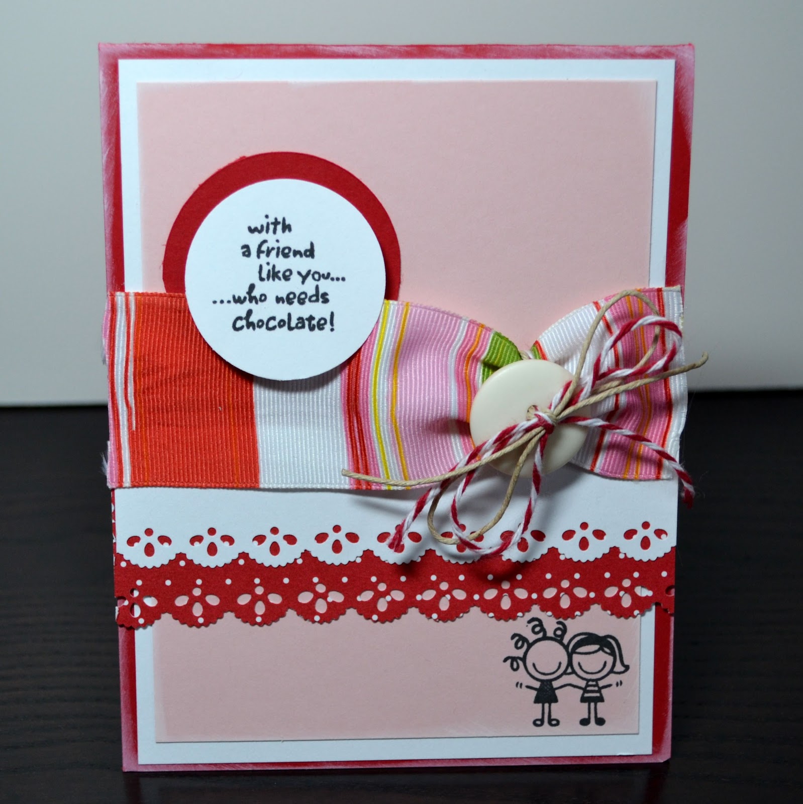I bet you have a girlfriend that loves chocolate. Mara created this cute Smirk card with the sentiment – "with a friend likes you who needs chocolate?" Love the choice of ribbon and combination of papers here!