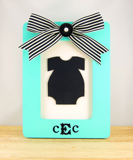 I actually do both with close friends. Before the baby is born, I always stick to the registry for the mom's sake. After all, parents legitimately need a stroller, a pack & play, car seat and high chair and the purpose of the shower is to help the families out by getting them what they need. When the baby arrives, I like to give a little something sentimental. Something monogrammed works great. Here's a picture frame idea by Kelley Eubanks. She's stamped the baby's monogram on the bottom of the frame using PSA Essentials black ink and her PSA Archive Peel & Stick stamps. The turquoise on the painted frame and the black and white ribbon are such a great contrast. She's used a really heavy weight ribbon and sturdy frame - this is a lasting gift.